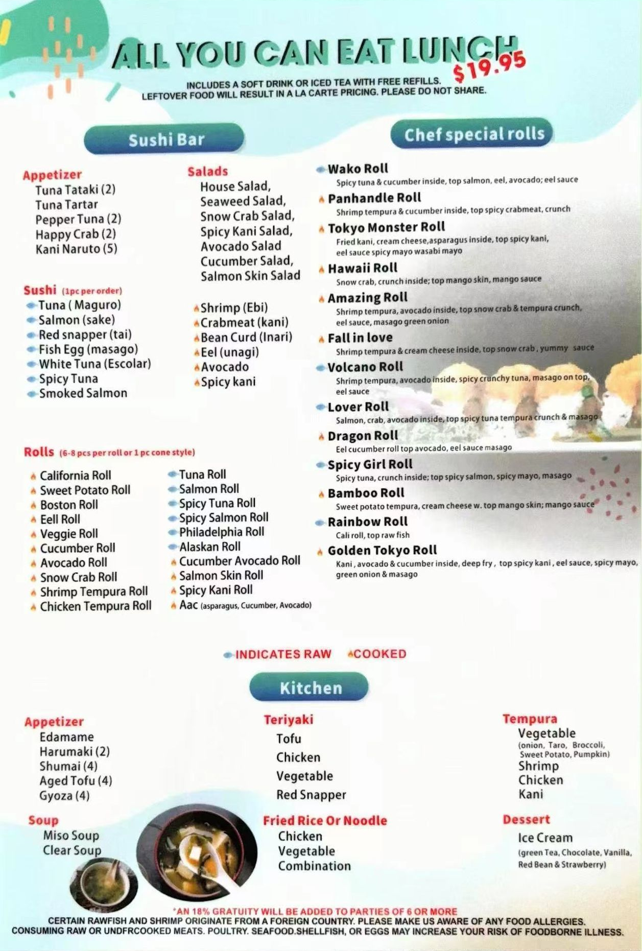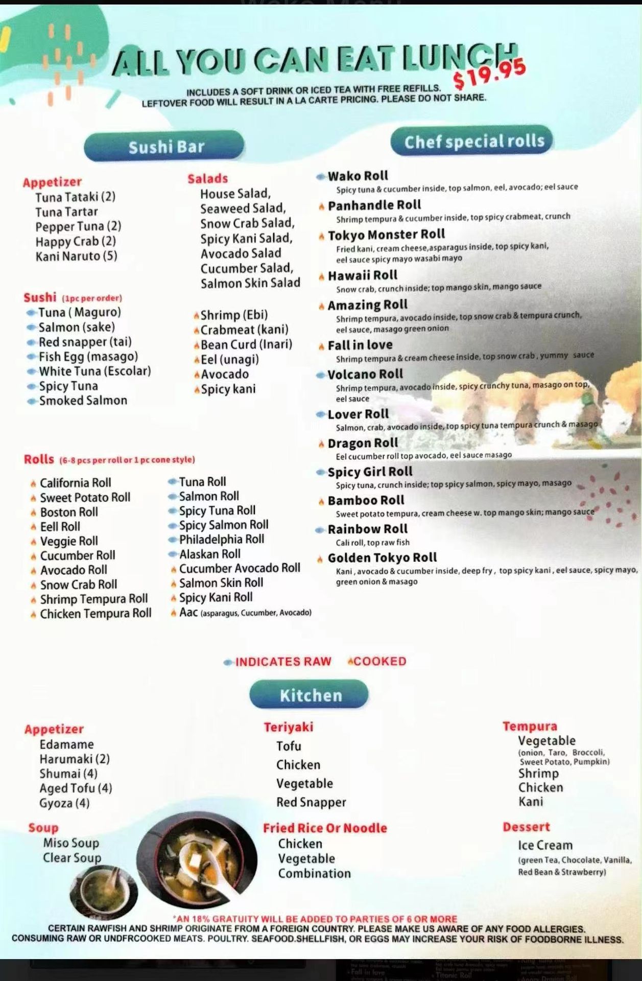 Enjoy All You Can Eat lunch and a variety of kitchen and sushi bar specials including bento boxes, donburi, hibachi, and more at Wako Japanese Cuisine.